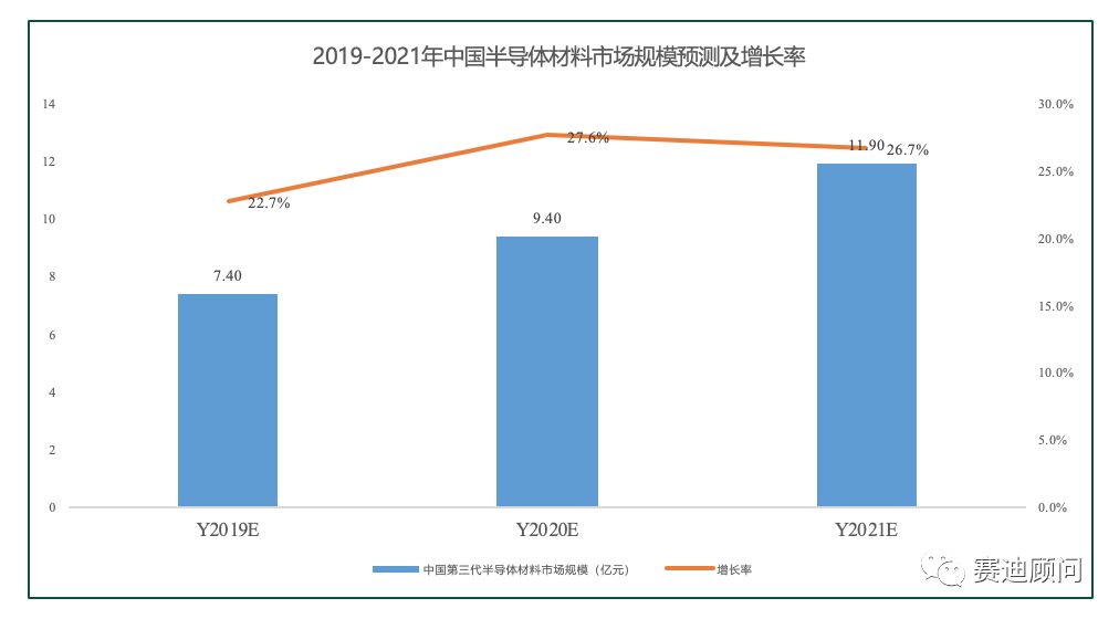 预计未来三年中国第三代半导体材料市场规模仍将保持20%以上的平均增长速度,到2021年将达到11.9亿元。