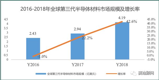 第三代半导体材料具有优越的性能和能带结构,广泛于射频器件、光电器件、功率器件等制造,具有很大的发展潜力。目前第三代半导体材料已逐渐渗透5G通信和新能源汽车等新兴领域市场,被认为是半导体行业的重要发展方向。2018年,全球第三代半导体材料市场规模为4.19亿美元,同比增长42.6%。