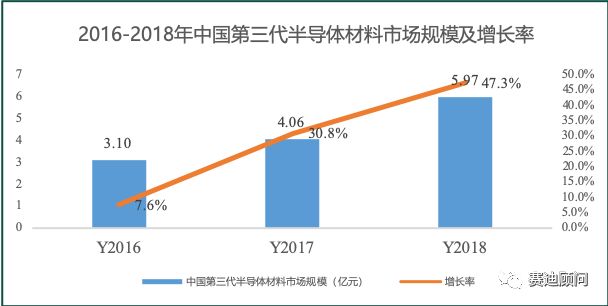 2018年,在5G、新能源汽车、绿色照明等新兴领域蓬勃发展以及国家政策大力扶持的双重驱动力下,我国第三代半导体材料市场继续保持高速增长,总体市场规模已达到5.97亿元,同比增长47.3%。