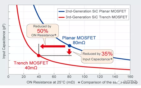 沟槽结构成本和性能优势明显。目前ROHM Gen3结构(Gen1 Trench结构)的芯片面积相当于是Gen2(Plannar2)的75%,同一芯片尺寸的导通电阻可降低50%。