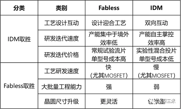 Fabless的主要优势:一是如果做MOSFET的话,那国内IDM还不具备成熟的工艺能力,只能选择代工去做,Fabless在MOSFET方面的进展速度快。二是如果一个代工厂所代工的产品已经有了现场验证数据,那这条供应链的基础可靠性已经得到了验证,比带着面纱的国内供应链更易于让客户接受;三是如果后期代工厂逐步切换到8英寸,那么设计公司也能跟随切换到8英寸平台,不需要额外的工艺研发和资本性支出的包袱。