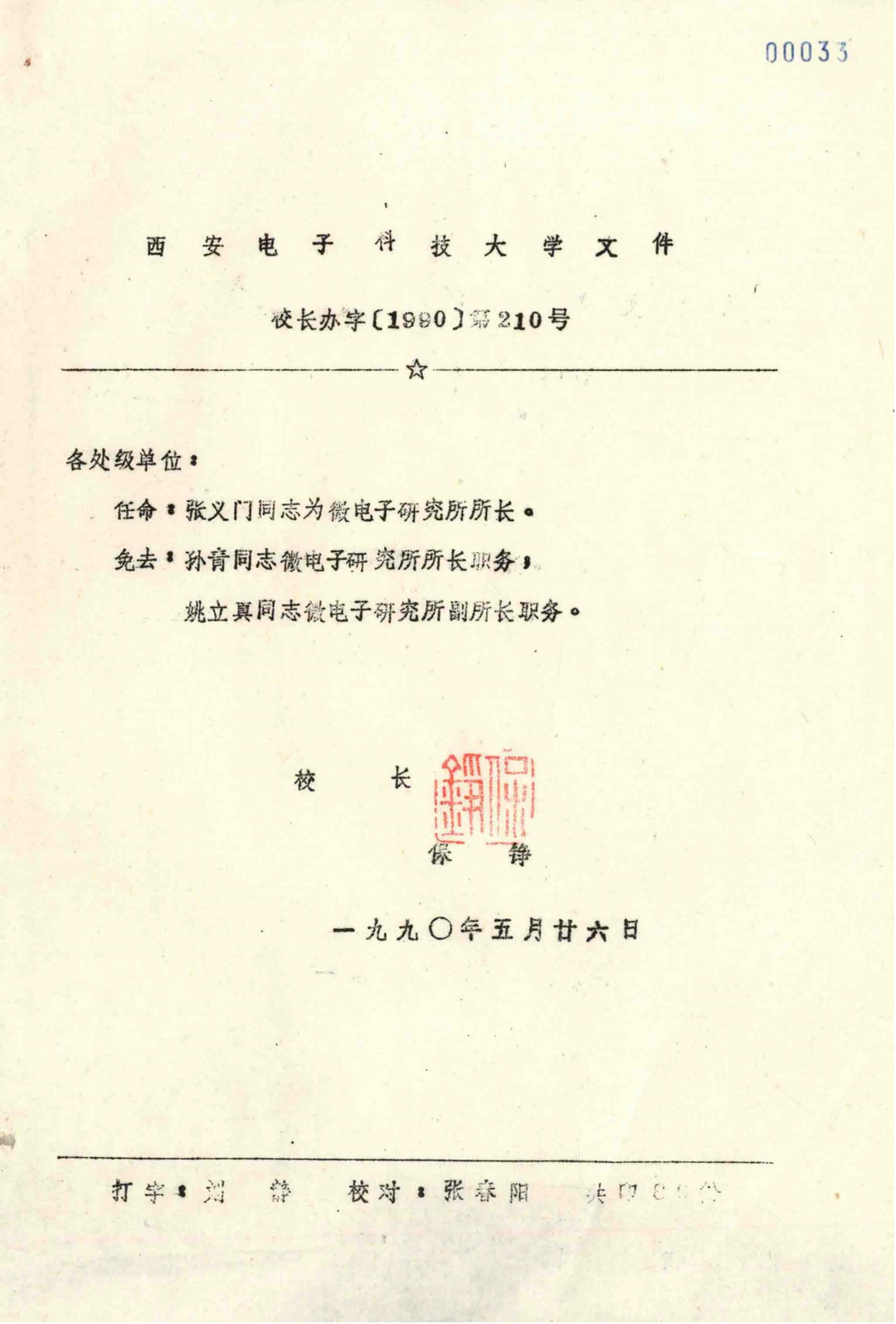 ▲张义门被任命为微电子研究所所长(现藏西电档案馆)