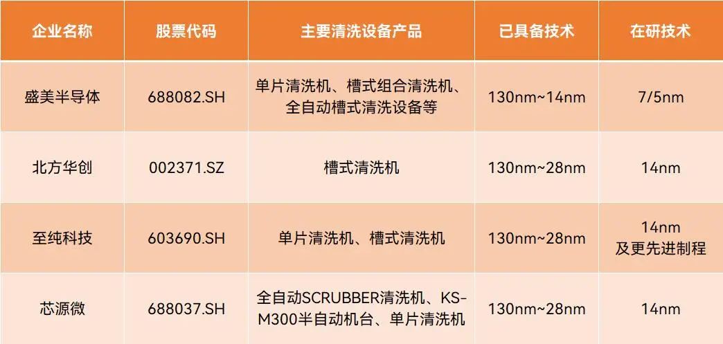 目前四家国产企业均已具备130nm~28nm主流制程清洗设备技术,其中盛美半导体已在研7/5nm清洗设备技术。