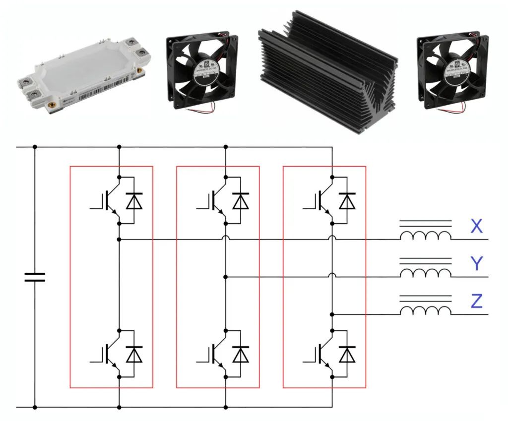 基于 Si 的高功率设计(例如 AFE 示例)通常使用 IGBT。图 2 显示了功率模块电路图及其物理散热要求。为了使用同类最佳器件,从目前主流的 IGBT 模块选择了一种模块,这些模块采用 EconoDUAL® 封装。该拓扑需要三个这样的功率模块 - 图中所示的每个红色框包括一个功率模块、一个散热器和两个风扇。