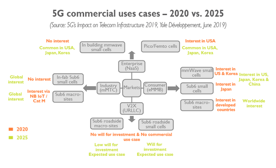图 1:据Yole Développement,到2025年,各种5G商业应用将使用在最合适的频段,主流为sub-6 GHz的宏基站和小基站。[2]